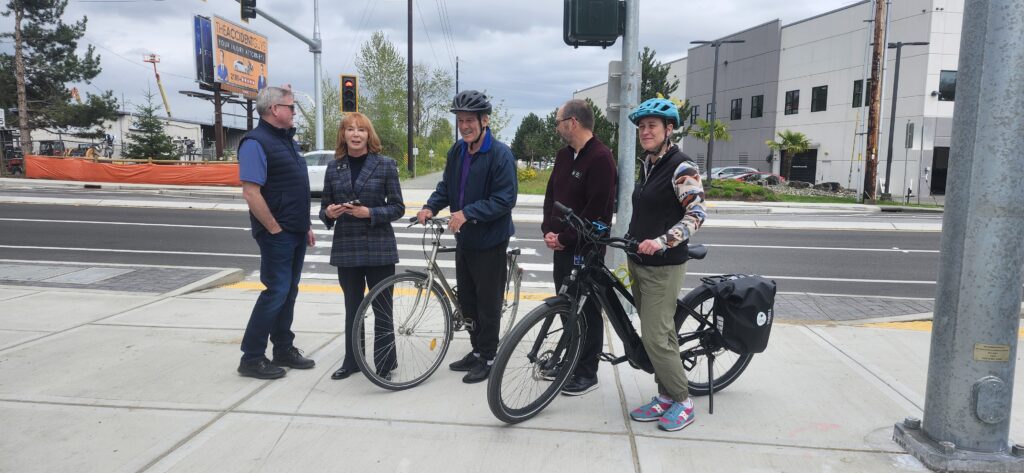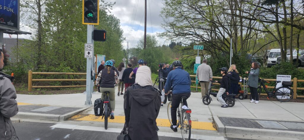 A challenging intersection on the Eastrail in Kirkland has received a major safety upgrade. Yesterday, the City of Kirkland celebrated the opening of a new signalized crossing at the intersection of Eastrail and Slater Ave NE, located just a half mile east of the Totem Lake Connector Bridge. Eastrail Partners joined City staff and elected officials at the celebration ceremony yesterday, where trail users were already enjoying the safer, more direct crossing.