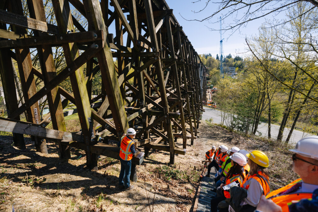 Last week, King County Executive Girmay Zahilay joined partners for a tour of a unique capital project that is transforming the 1,000-foot-long Wilburton Trestle in Bellevue – the longest wooden trestle in the Pacific Northwest – into a trail bridge for the emerging 42-mile Eastrail.