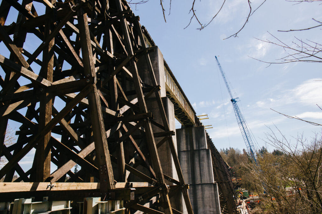 Crews are now installing the 20-foot-wide trail surface, railing, and three expansive viewing platforms atop the 122-year-old trestle. They are also replacing deteriorated wood and hardware while reinforcing the pillars with modern safety upgrades that will make it more resilient during earthquakes.
